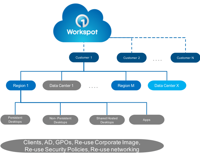 Workspot is a multi-tenant solution, so it can handle tens of thousands of customers. But it also enables every customer to deploy across multiple regions (and on-prem data centers too if that’s what you need to do) and manage everything from a single pane of glass. And in each region, the customer could deploy virtual apps and desktops to thousands of users. In a separate blog I talk about the New Math of VDI Performance; here is The New Math of VDI Scalability: #customers * #regions * #users per region. A single VDI control plane now needs to handle 1000 customers * 5 regions * 1000 users = 5 million users.