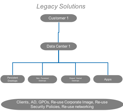 Legacy VDI has been all about infrastructure. Customers had to buy expensive servers, storage, and networking, hire consultants and set up a complex stack on-premises to be able to deliver virtual desktops to end users. The old way looks like this: Many variables to contend with and lots of money spent doing it.