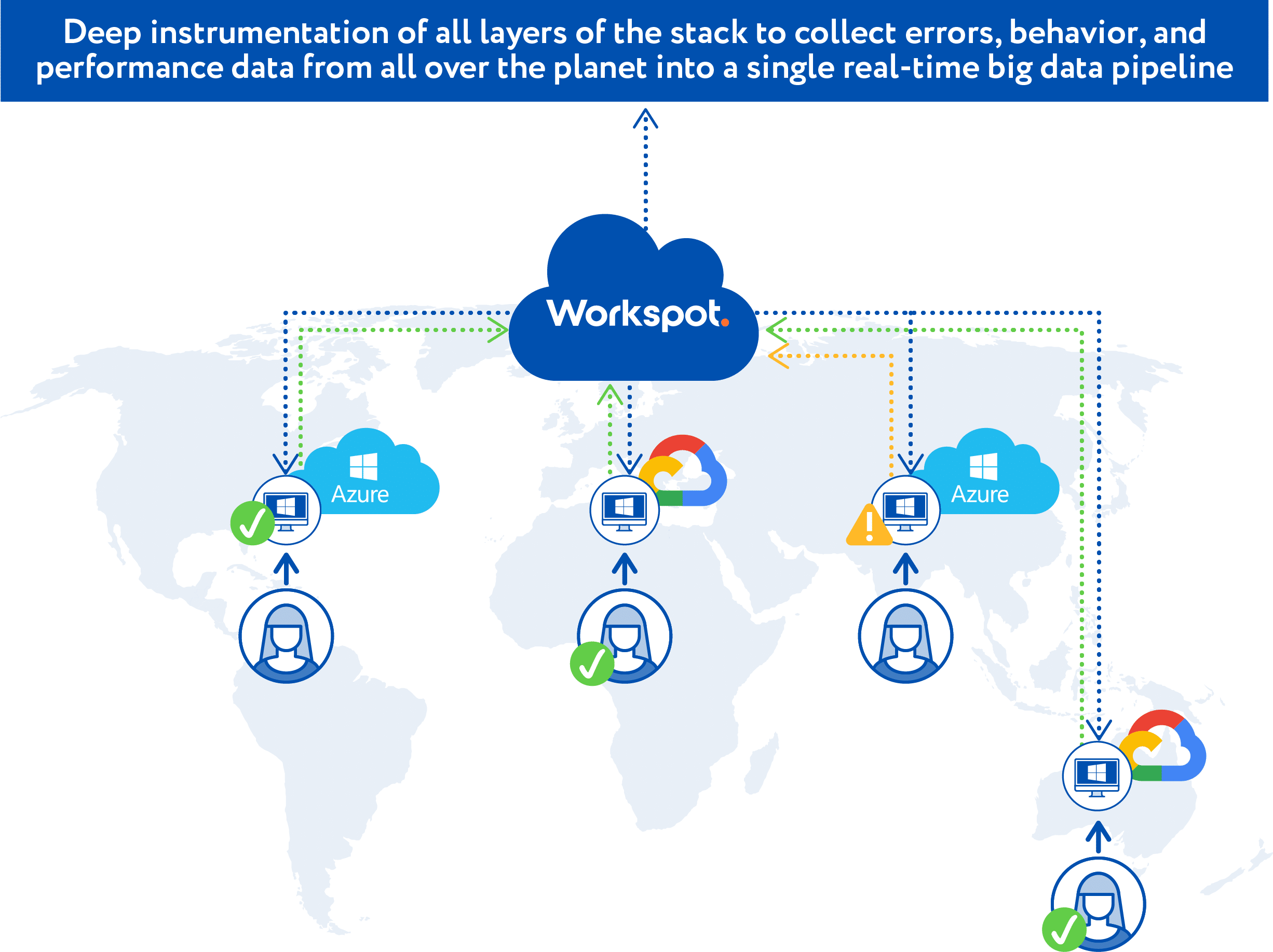The first step in delivering a better SLA is to know what is going on everywhere. We start with the user’s point of view. If a user is unable to connect to their virtual desktop or is seeing poor performance (due to high latency or low bandwidth), we need to know about it in real-time. Next we need to know about everything in between that the user touches in order to connect to their virtual desktop – the network, the gateway, the region of the cloud and the virtual machine. Plus other infrastructure components that are needed to deliver a desktop experience like AD, DNS, etc. And all of this needs to happen in real-time. The cloud enables us to collect vast amounts of data in real-time.