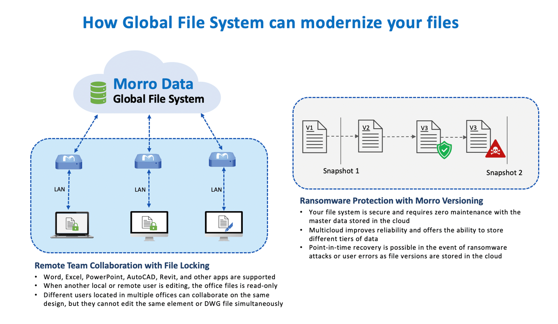 - Data versioning and snapshot capabilities: Morro Data’s powerful file versioning and snapshot features are essential in recovering from ransomware. In the event of an attack, these functionalities enable organizations to revert to a previous version of their data that was not impacted by the ransomware, which helps to mitigate the adverse effects of the attack. Compared to traditional snapshots, Morro File Versioning can recover to the very last file version before a ransomware attack, indicated as version 3 below. In contrast, a snapshot can only recover to version 1.