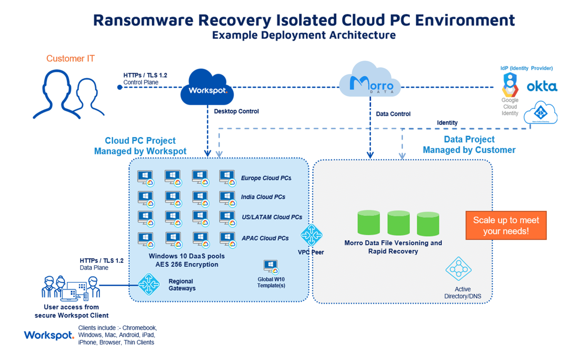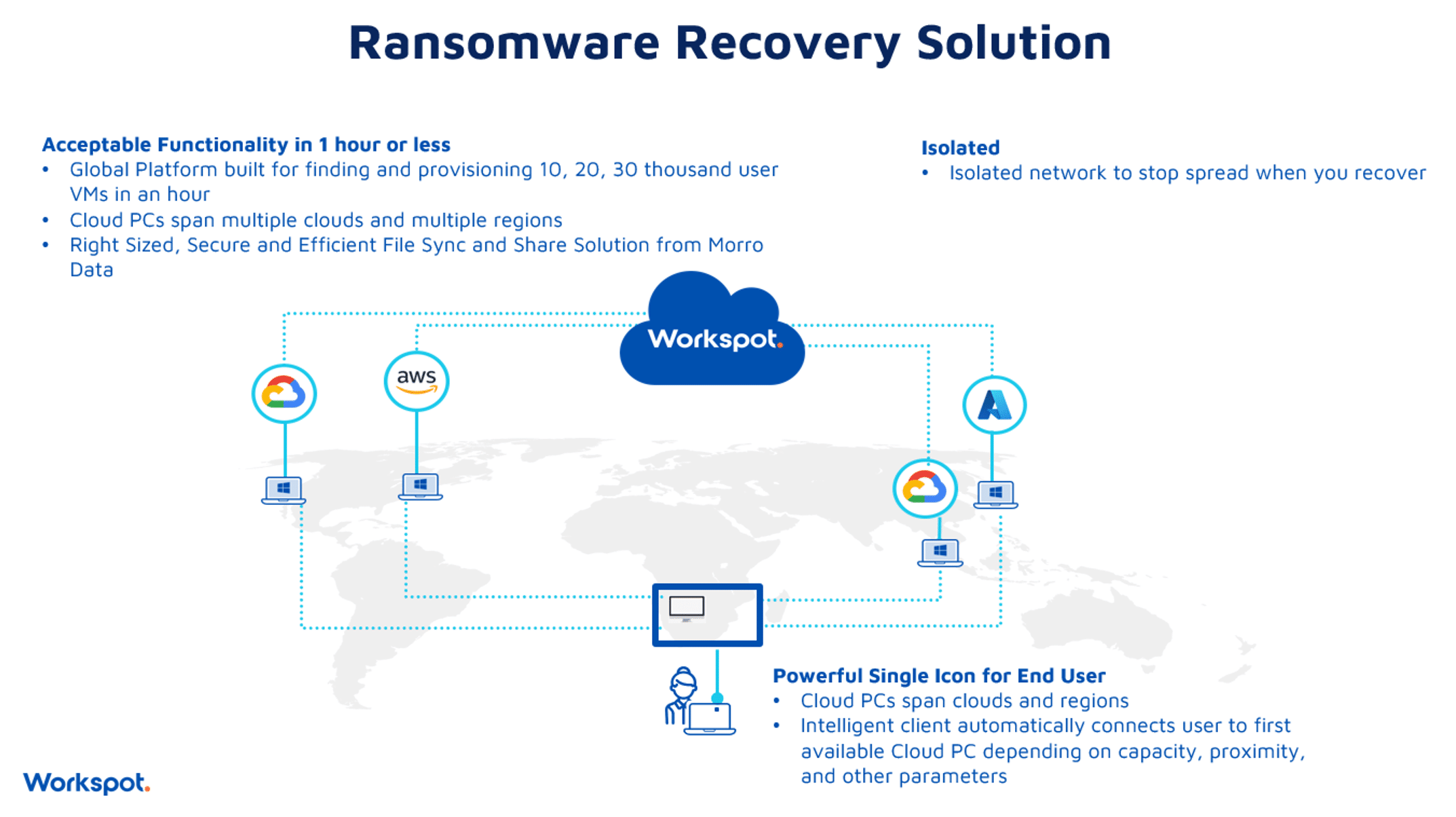 In the event of a business disruption, including a ransomware attack, Workspot’s innovative end-user computing solution enables rapid deployment and restoration of virtual desktops across multiple public clouds and geographies, considerably reducing the considerable downtime associated with ransomware mitigation while also easing the operational burden on IT. Complementing Workspot’s unique recovery capabilities is Morro Data’s solution. It combines sophisticated data encryption, real-time synchronization, and versioning capabilities, offering a powerful defense against ransomware attacks and making restoring data easy. Together, these technologies provide a powerful defensive and offensive strategy for combating the growing threat ransomware poses. This strategy allows businesses to protect their digital assets and continue operations without interruption.