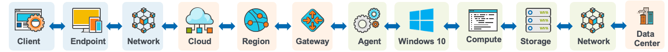 We are focused on delivering simplicity – simple to deploy, simple to scale and simple to operate. But behind the scenes there are multiple components that need to be coordinated in order to deliver our cloud PC service with the very best reliability and high-availability. The diagram below represents an end user using Workspot Client running on their endpoint-of-choice (Windows PC, Mac, iOS, Android, Linux), to connect over a network (WiFi, Cellular), to a public cloud (Azure and/or Google Cloud) to any of the dozens of cloud regions available from Azure or Google Cloud, the connection then traverses a gateway to a Windows 10 cloud PC running the Workspot Agent. The cloud PC itself may be connected through S2S networking to the corporate data center.