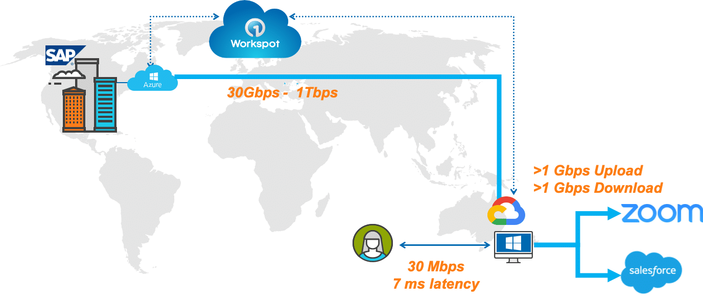 With Workspot on the public cloud, network traffic traverses high bandwidth cloud backplanes.