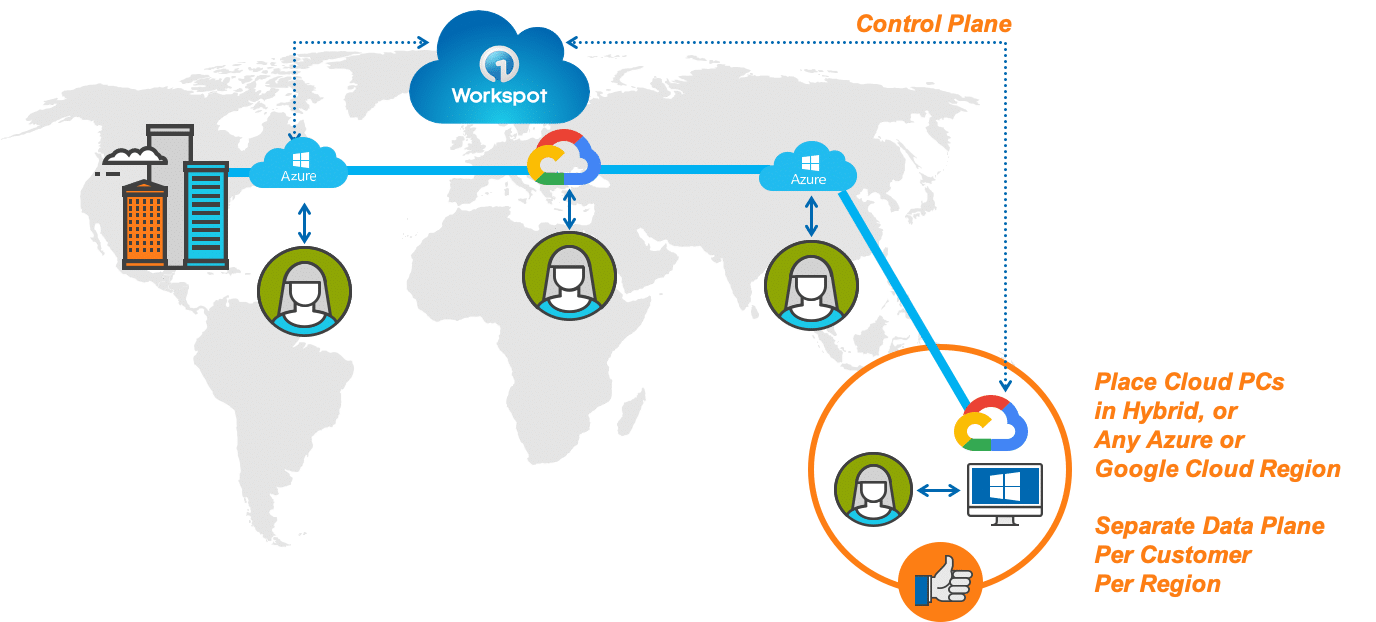 Workspot’s control/data plane separation affords customers massive cloud PC scalability across Azure and Google Cloud.