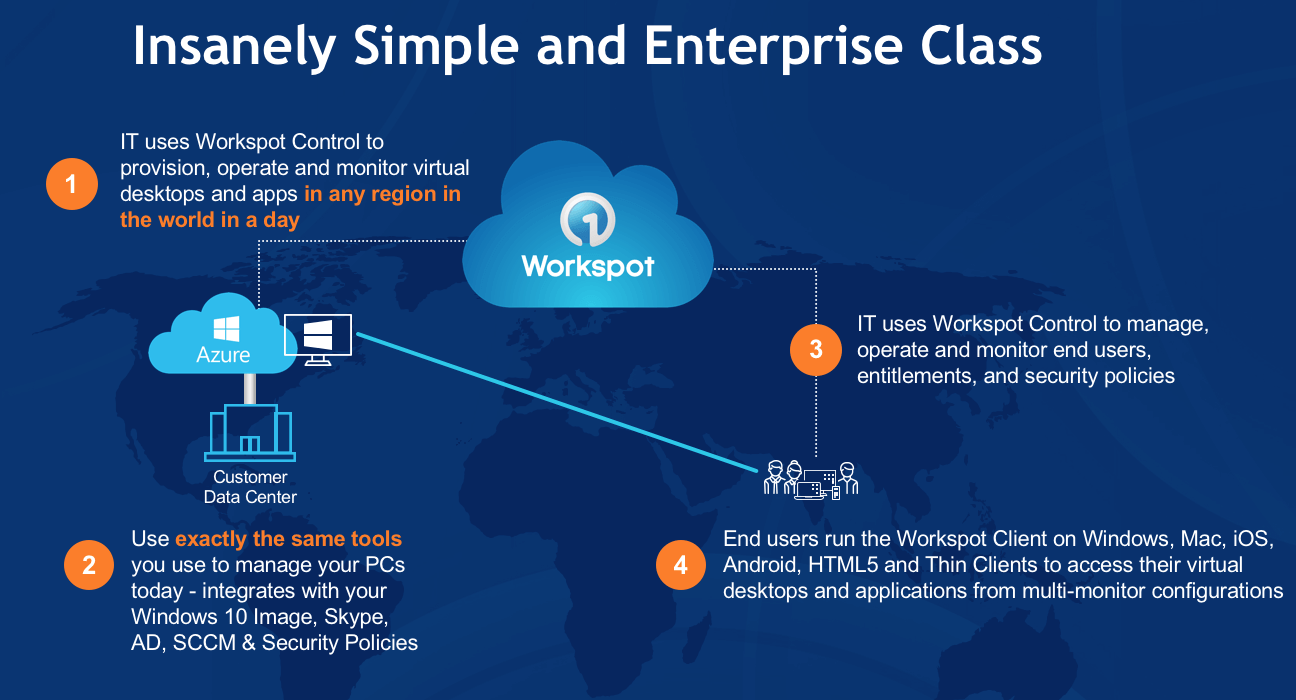 If you think back to the good ‘ole days of deploying and managing Exchange servers, you’ll surely remember how painful everything about that experience was. There’s a good reason why on-prem Exchange servers have pretty much disappeared, and that reason is Office 365. With Office 365, IT teams no longer have to worry about storage, or upgrades, or patches, or performance. By adopting the Office 365 cloud service, everything has been dramatically simplified, yet the solution is very much enterprise-ready and enterprise-proven. That’s what we’ve achieved at Workspot. Our Cloud PC service alleviates IT teams from worrying about the “I” in VDI. You don’t have to deal with virtual desktop infrastructure anymore – forget about servers, storage, networking, and hypervisors. Forget about managing all the elements of a VDI control plane. We do that for you. That’s a dramatic simplification. We’ve made it insanely simple for you, precisely because we know the pain of complex, legacy VDI solutions. Here’s the 1, 2, 3 of Workspot Desktop Cloud on Azure: