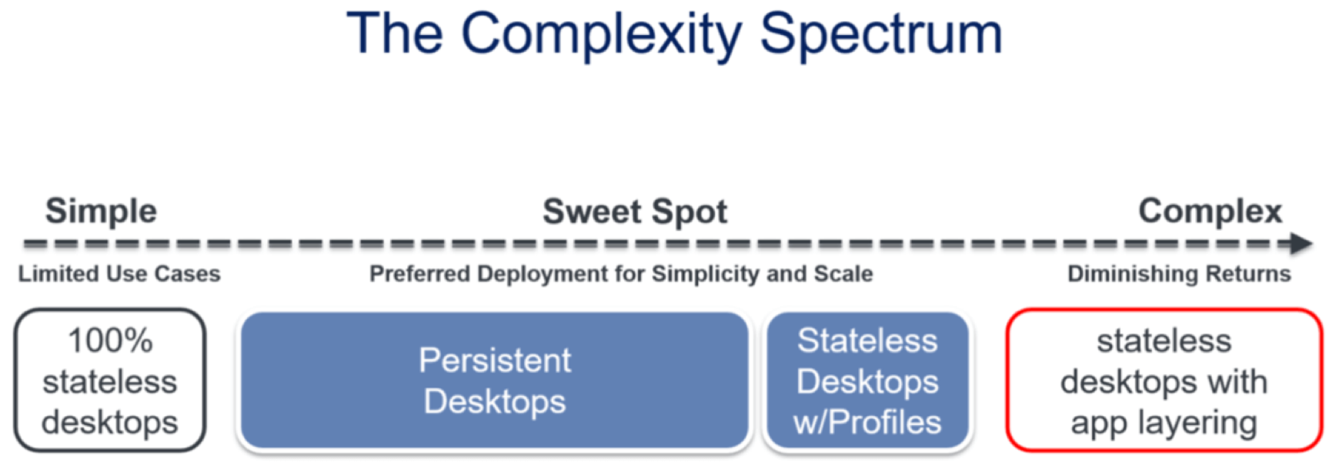 You may think of “stateless” as being the holy grail, but in reality, it’s very hard to achieve truly stateless desktops and the proof points are not there. For most customers with limited IT staff, there are diminishing returns if every application in the company has to be converted to a new format and expensive consultants are required to implement “user layers”. When you double click and begin examining all these questions, you realize that there are (too) many steps required for deploying your first non-persistent desktop.