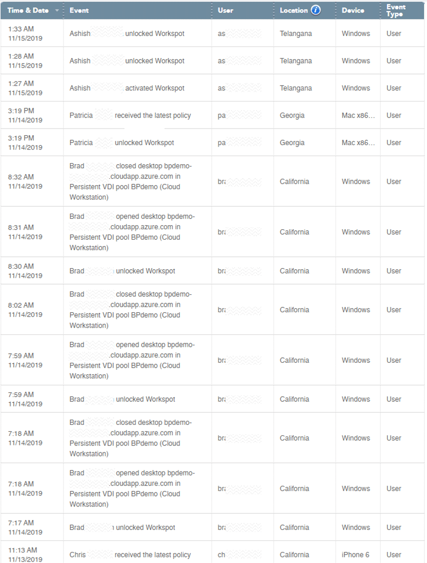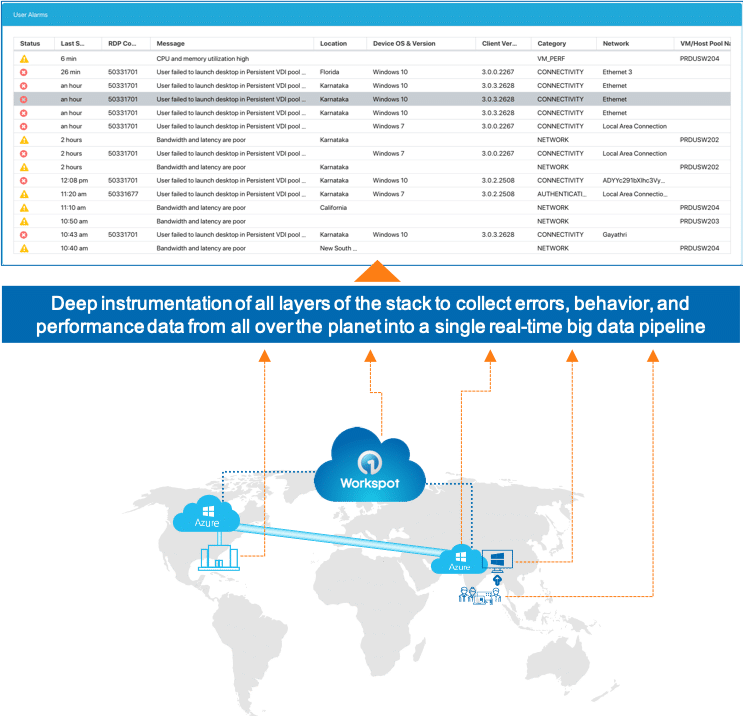 Data is the lifeblood of delivering stellar service levels. Because we have instrumented so many of the systems involved in delivering our cloud desktop service, we have near real-time data that gives us a comprehensive picture of what end-users are experiencing. We collect access data from the end-user client, their desktop agent, Workspot Control, and the public cloud infrastructure.