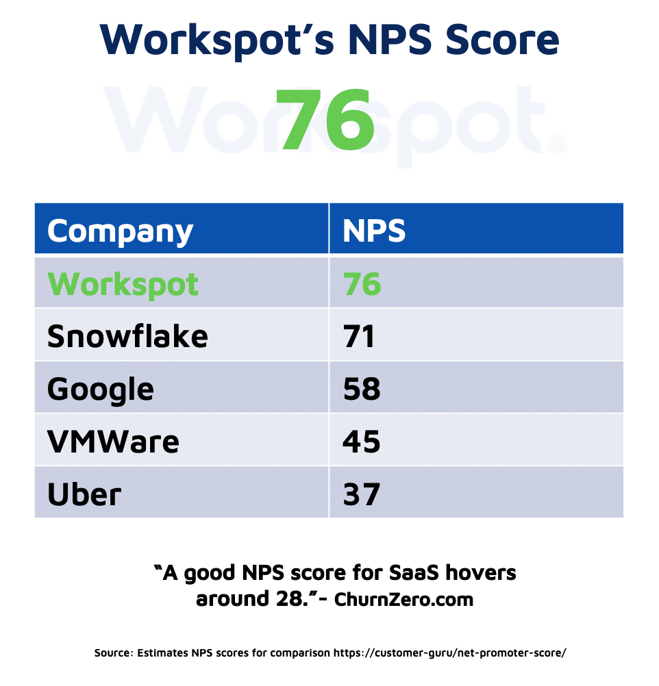 Workspot achieved an NPS of 76 – off the charts and far ahead of its competitors and the SaaS pack in general. Not only does this validate what Workspot already believed about the health of its customer relationships, but the NPS process also serves to open new lines of customer communication, reinforces the value placed in customer relationships, and helps obtain valuable customer feedback to drive continuous improvement.